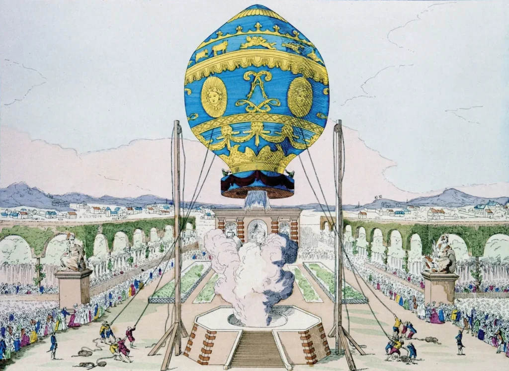 Varmluftsballonger uppfanns i Frankrike 1783 av bröderna Joseph och Étienne Montgolfier. Bröderna arrangerade en demonstration inför Ludvig XVI och kungafamiljen i slottets gård. Passagerarna på den första testflygningen var ett får, en anka och en tupp.