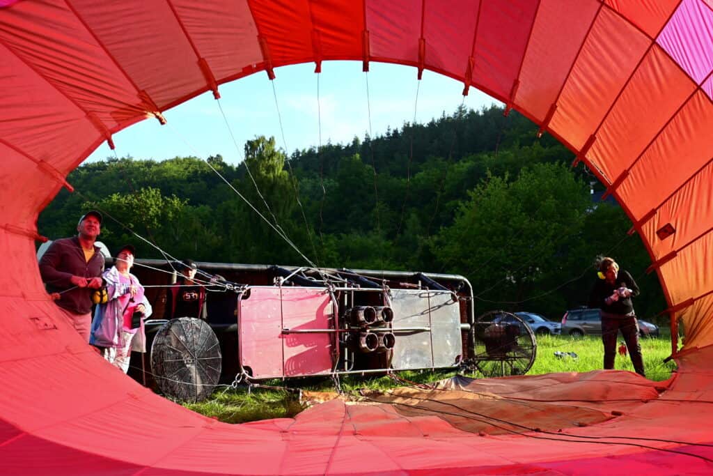 This is the part that surprises everyone. The envelope is spread across the grass like a sleeping giant. Fans fill it with cold air, then the burner roars and the fabric rises. You’re invited to help hold the envelope open and watch it take shape from the inside. It’s hands-on, exciting, and makes for some of the best photos of the day.